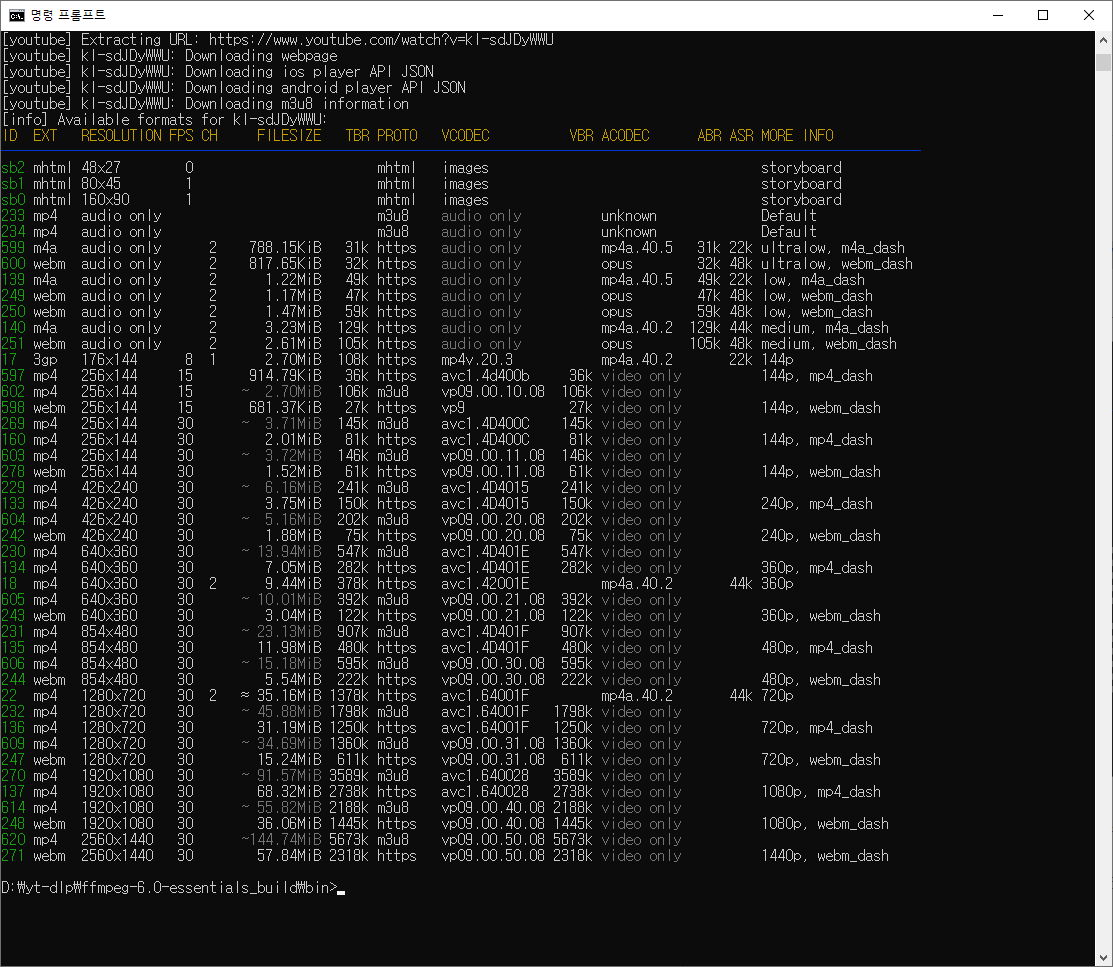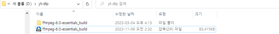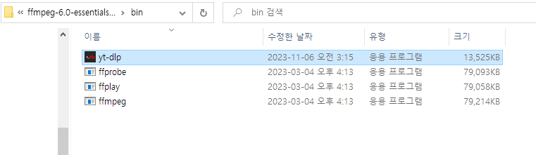 cd D:\yt-dlp\ffmpeg-6.0-essentials_build\bin (해당 위치로 위치변경)
