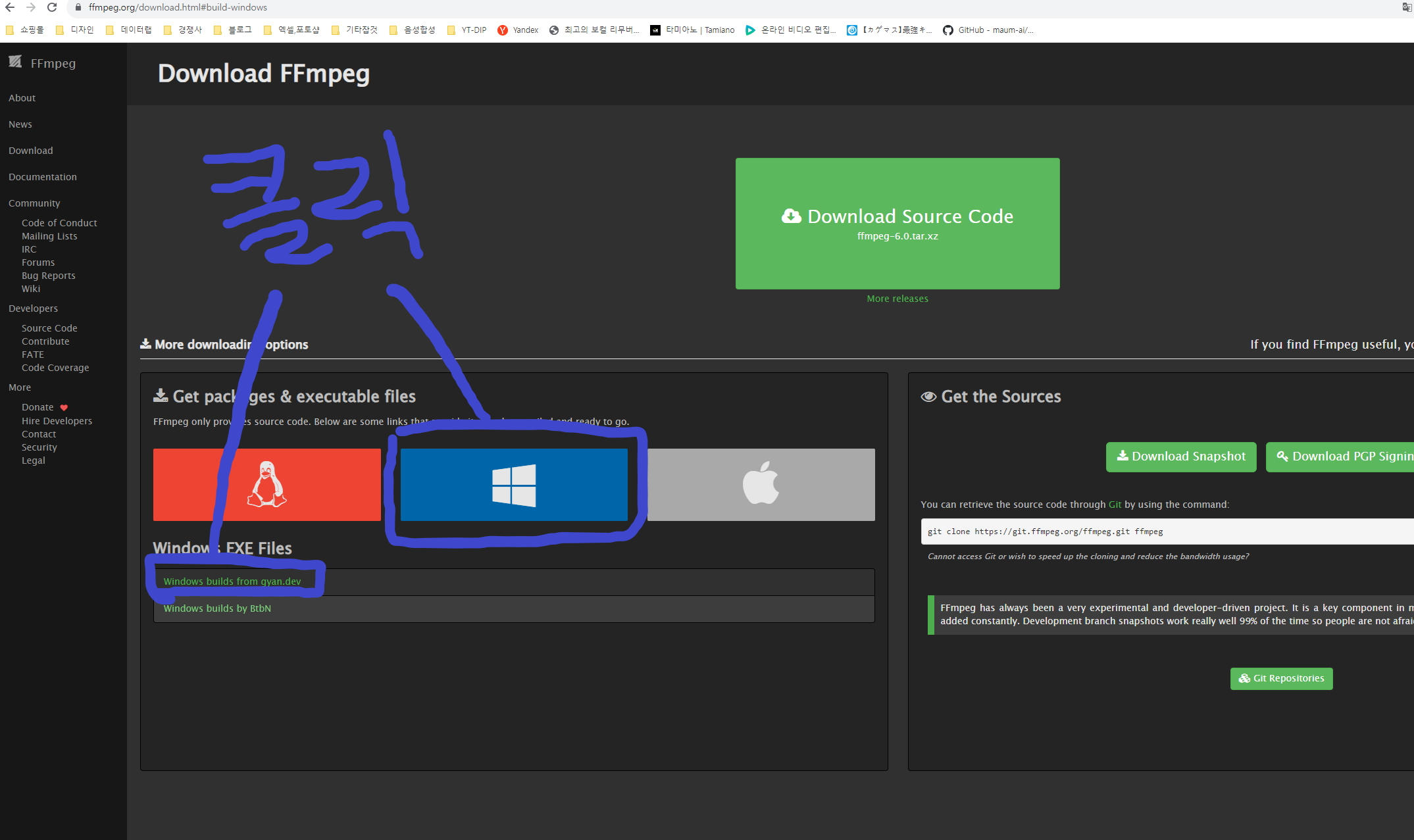 윈도우 사용자는 저처럼 윈도우 아이콘에 마우스를 가져다 대고 WIndows builds from gyan.dev를 클릭해 줍니다.