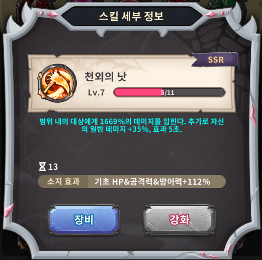 암흑 공격은 1 티어 스킬이므로 필수로 넣는 게 좋고 천외의 낫은 높은 등급의 스킬이 있으면 대체가능합니다~