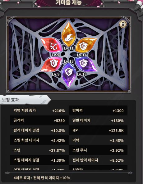 같은 종류의 거미줄을 착용할 경우 최대 4세트 효과까지 받을 수 있습니다!