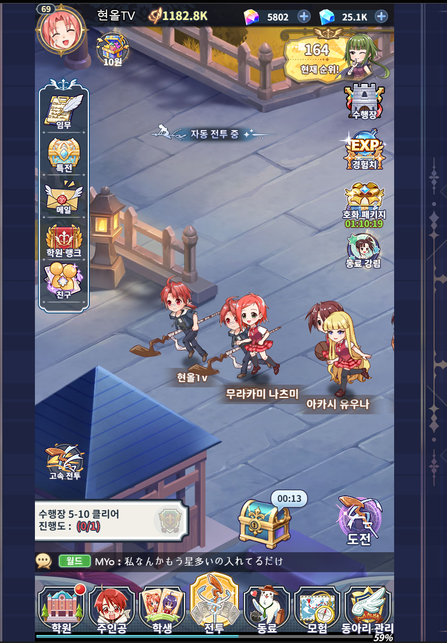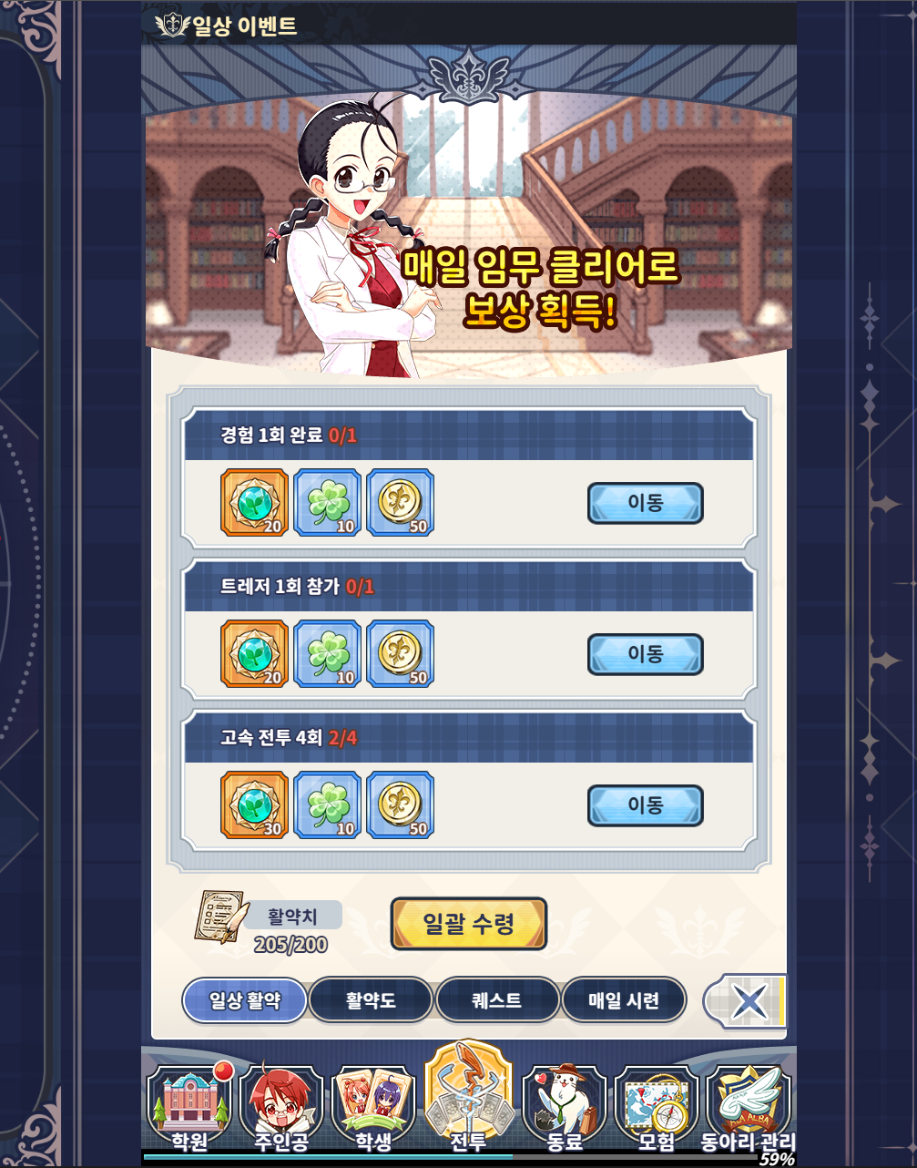 일일 미션과 퀘스트를 하여 매일마다 재화를 받을 수 있고 수행장이라는 시스템으로 랭크를 올릴 수 있네요~